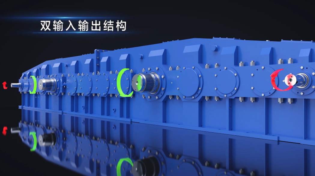 Double-input and output structure with synchronous output, forced lubrication, balanced load, high load capacity, and strong impact resistance.